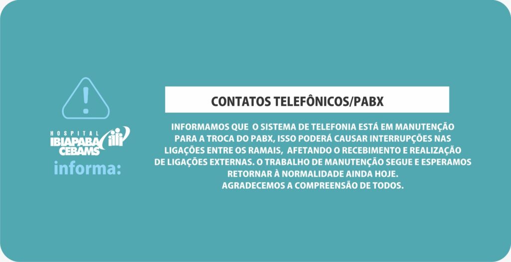 Informamos que o sistema de telefonia do Hospital Ibiapaba CEBAMS está em manutenção para a troca do PABX. Isso poderá causar interrupções nas ligações entre os ramais, afetando o recebimento e a realização de ligações externas. O trabalho de manutenção segue e esperamos retornar à normalidade das linhas ainda hoje (09/02/2023). Agradecemos a compreensão!