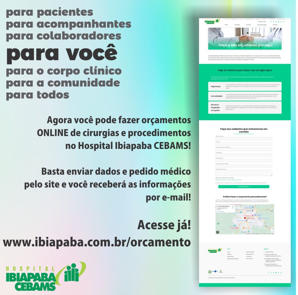 Com o objetivo de oferecer a melhor experiência para nossos pacientes, o Hospital Ibiapaba CEBAMS traz uma novidade em seu site: orçamento online de cirurgias, exames e procedimentos! A plataforma, disponível em https://ibiapaba.meuteste.dev.br/orcamento , traz maior comodidade e praticidade para pacientes, que não precisam deslocar-se mais a Barbacena para realizar orçamentos de procedimentos particulares. O pedido de orçamento pode ser feito de casa, através do computador, tablet ou celular.