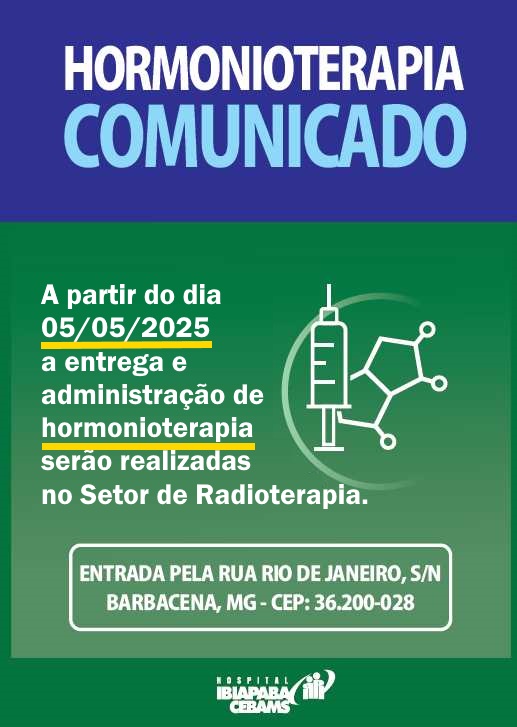 O Hospital Ibiapaba CEBAMS comunica a pacientes e familiares que partir do dia 05/05/2025 (segunda-feira) a entrega e administração das medicações de hormonioterapia serão realizadas na Radioterapia do Hospital Ibiapaba CEBAMS.