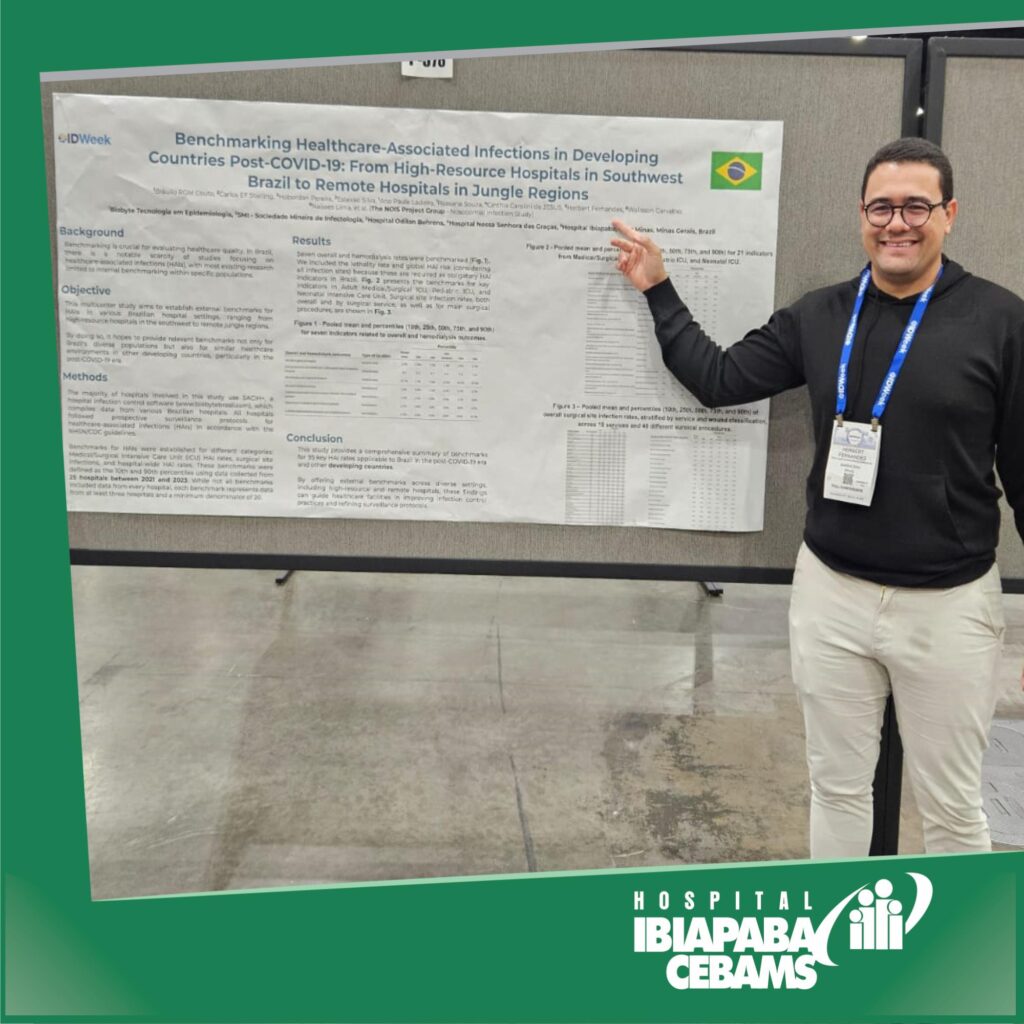 De 16 a 19 de outubro de 2024 aconteceu o Congresso IDWeek, realizado em Los Angeles (EUA). O evento, que apresenta as principais atualizações no campo da infectologia, teve a participação do Dr. Herbert Fernandes, médico infectologista do Hospital Ibiapaba CEBAMS. Ele apresentou o trabalho “Comparação de infecções associadas à assistência à saúde em países em desenvolvimento pós-COVID-19: de hospitais de alto recurso no Sudeste do Brasil a hospitais remotos em regiões de selva”, feito em parceria com pesquisadores de diversos hospitais e universidades de Minas Gerais e do Pará.