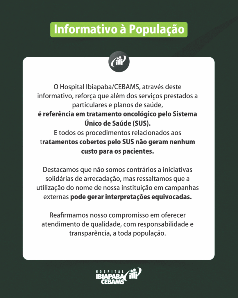 Após a verificação de publicações recentes em redes sociais de campanhas de arrecadação na modalidade “vaquinha virtual,” para pacientes usuários do Sistema Único de Saúde (SUS), o Hospital Ibiapaba CEBAMS veio a público com uma Nota (reproduzida abaixo) onde reafirma que os pacientes oriundos do SUS têm todos os seus tratamentos, custeados pelo sistema público, não fazendo qualquer cobrança extra ou complementar. A Nota diz ainda que a instituição não se opõe a qualquer iniciativa desta natureza, desde que fique expresso nas publicações que os valores arrecadados não são destinados aos serviços prestados pelo Hospital Ibiapaba CEBAMS.